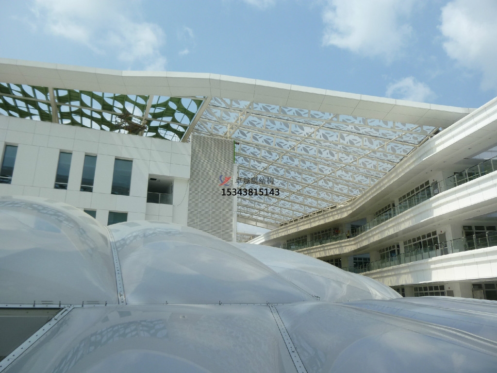 ETFE膜結(jié)構(gòu)透光性怎么樣?ETFE膜材自身由于直接熱塑成形,厚度很薄,原本就具有很高的透光率。通過(guò)對(duì)膜材表面鍍銀色圓點(diǎn)可以調(diào)節(jié)膜材的透光率,從而滿足室內(nèi)不同的采光需求。
